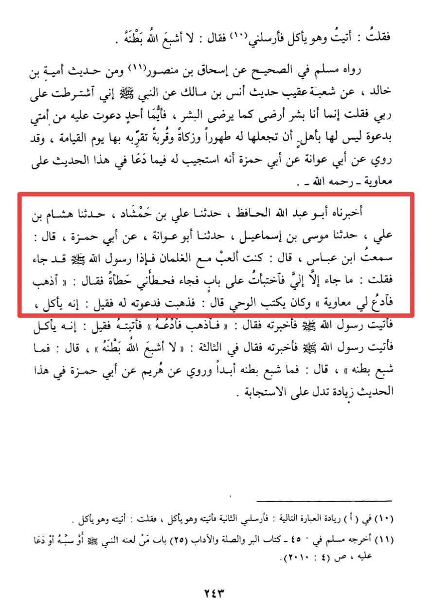 "Hazrat Syedna Abdullah Ibn Abbas Radiallahu Anhu ne farmaya Mai baccho ke saath khel raha tha ke itne me Nabi E Karim ﷺ tashreef laaye, mai samjha ke Aap mere liye tashreef laaye hai lihaja mai darwaje ke piche chupp gaya to Aap Ne mere kandho pe haath rakha, aur farmaya Muawiya Ko Bula Laao, Muawiya Radiallahu Anhu Wahi Likhne walo me they,"